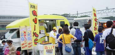 スポーツ施設をはじめ、各種レース場、競技場の開催に合わせて出張販売をしています。また、企業のイベント、催し物のキャンペーンやノベルティとして、パチンコ屋さんのオープンイベントの無料配布など、買取企画の出張営業も行います。お呼びいただければ関東一円どこへでも出張販売にお伺いします。